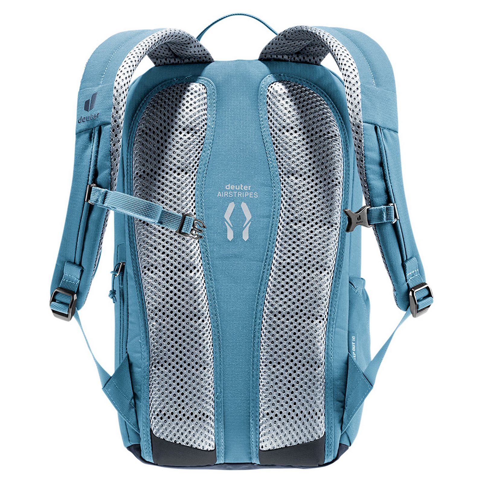 Завдяки перфорованим плечовим ременям ергономічної форми та зменшеної контактної поверхні спинної системи Deuter Airstripes визначними якостями Stepout є вентиляція та комфорт при носінні. Велика U-подібна застібка-блискавка зверху, кишеня для мобільного телефону збоку на спині та еластичні бічні кишені забезпечують швидкий доступ до важливих предметів. Усередині є сумка для документів та чохол для ноутбука для більш організованої упаковки. Тканина цього продукту bluesign®, сертифікованого Green Button, не містить ПФУ та виготовлена із 100% перероблених ПЕТ-пляшок (20 пляшок по 0,5 л) відповідно до стандартів bluesign®.