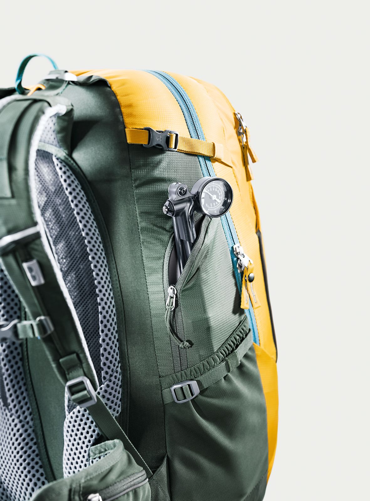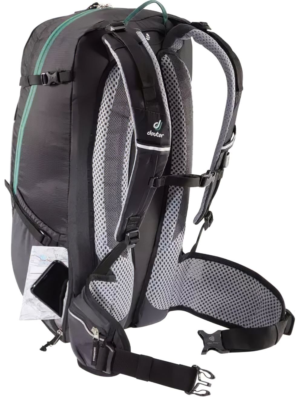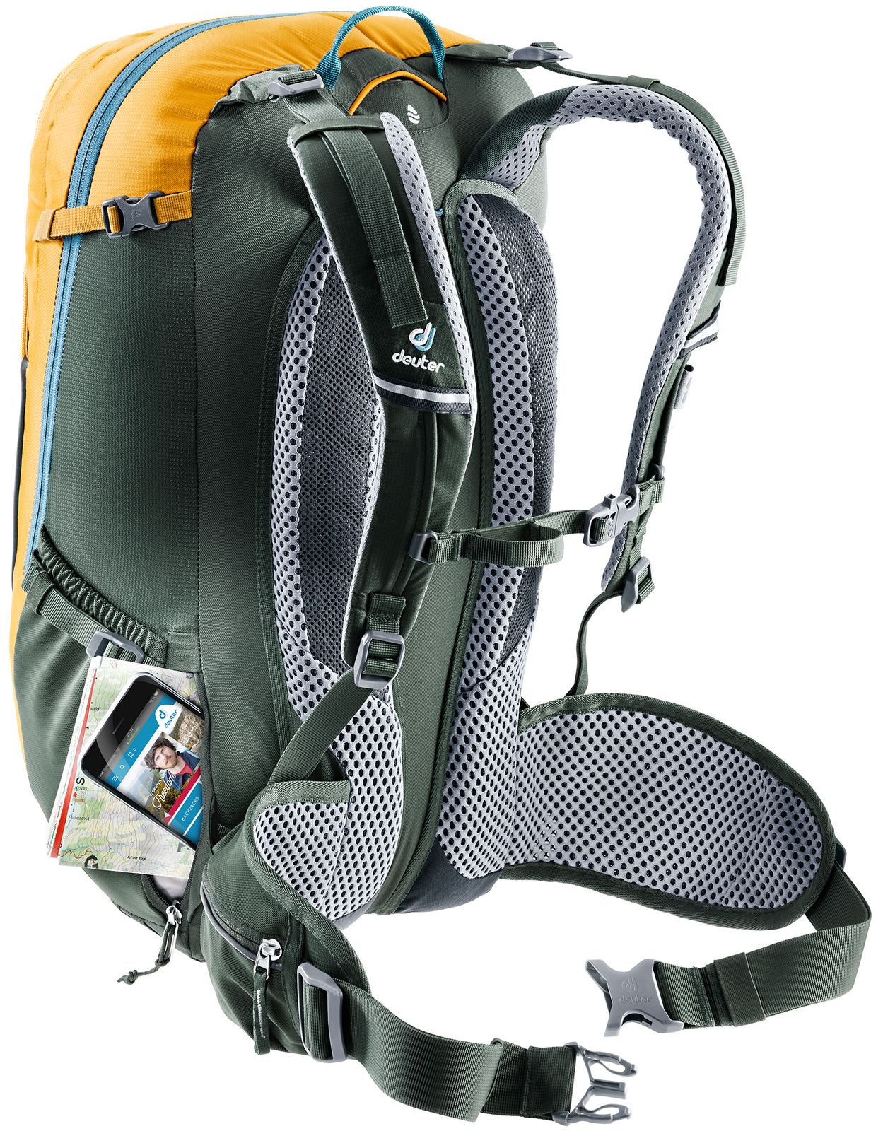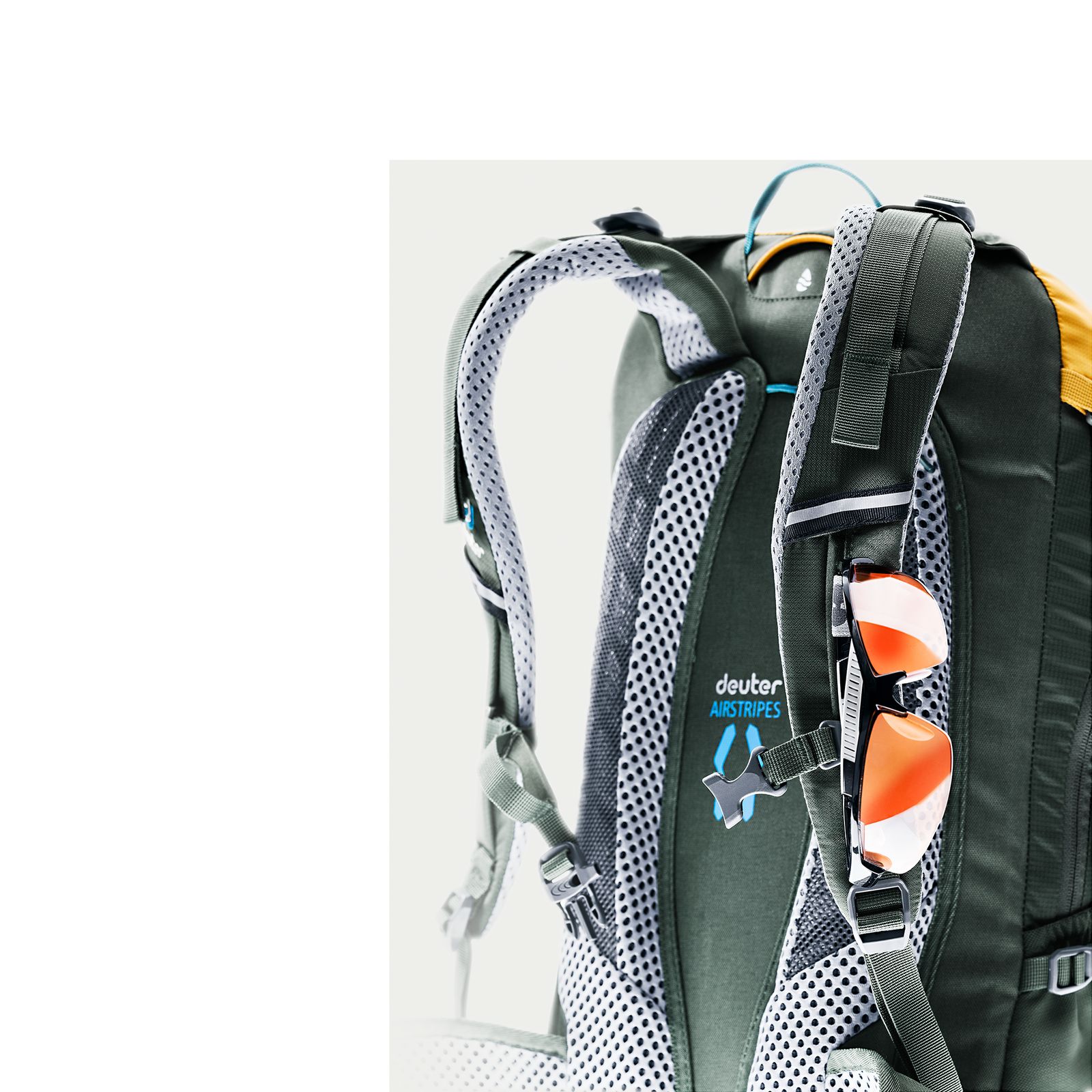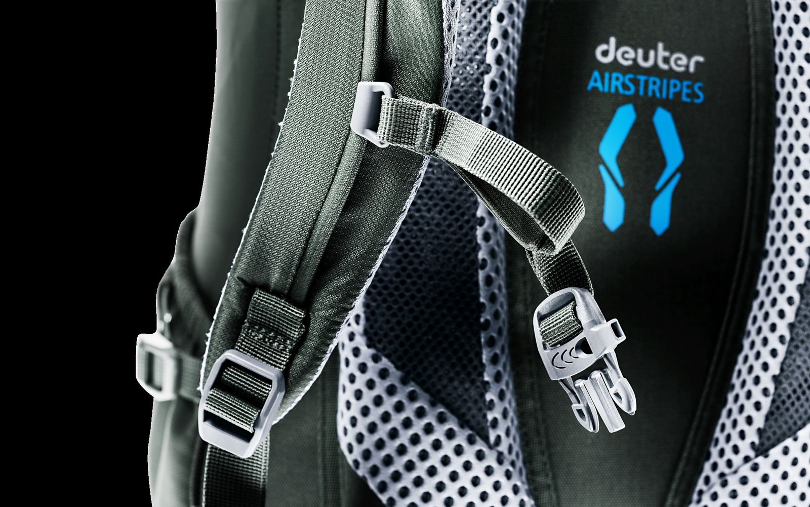 Специальная Extra Long модель рюкзака Дойтер Транс Алпайн с удлиненной спинкой для высоких велосипедистов ростом от 1,85 до 2,0 метров. Контакт подвесной системы Airstripes при надлежащей плотной посадке, создает свободное перемещение воздуха на 80-ти процентах поверхности спины пользователя благодаря уменьшенному обратному контакту подушек Airstripes и сетчатой подкладке Wide AirMesh, гарантируя стабильность груза даже очень сложной дороге. Анатомической формы плечевые лямки гарантируют удобную свободу передвижения. Легко регулируемый грудной ремень дополнительно обеспечивает наилучшую подгонку. Сетчатые крылья на поясном ремне гарантируют компактную, плотную посадку во время любых поездок. Гибкие алюминиевые пластины находящиеся внутри подушек Airstripes позволяют точно подстраиваться под спину пользователя, изменяя свою кривизну и таким образом обеспечивая точную индивидуальную подгонку.