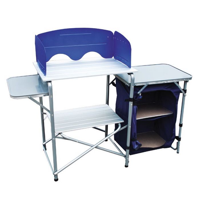 Похідна кухня має знімний складаний вітрозахисний екран, зручну шафку з полицями для зберігання посуду і продуктів. Ніжки можуть регулюватися по висоті, що надає додаткову стійкість. Кухня складається в кейс, зручний для транспортування і має додатковий чохол для, який захищає від подряпин під час перевезення і зберігання. Розмір столу в розкладеному стані: 139х46х80 см. Вага: 12,0 кг. Допустиме навантаження 40 кг.