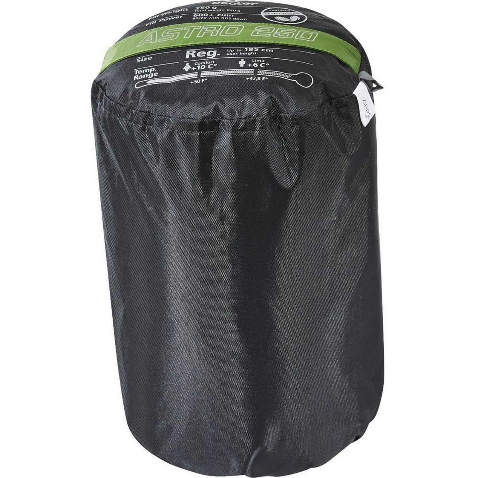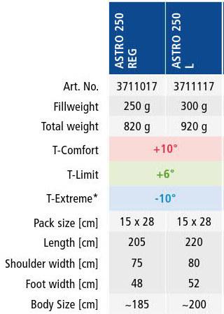 Пуховий спальник Deuter Astro 250 є відмінним вибором для теплого часу року з температурами завжди більше нуля градусів. Дуже хороший вибір для піших і велосипедних туристичних походів. Він досить легкий, всього 820 грамів, і відповідно компактний. Варіант з індексом Regular, це варіант для людей зростом до 1,85 м, індекс Long забезпечує комфорт людям високого до 2,00 метрів зростання.