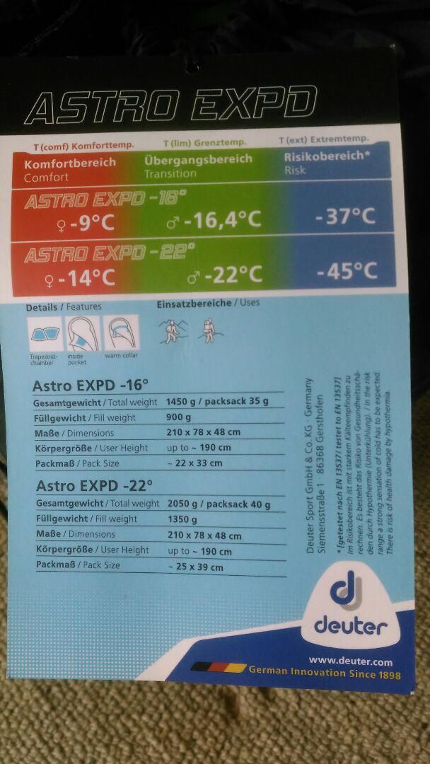 Експедиційний пуховий спальний мішок Deuter Astro EXPD -22°, сетрифицированная спеціалізована модель, спроектриованная спеціально для екстремальних умов, для зимових походів, експедицій, гірських сходження, альпінізму, коли необхідний гарантований комфорт в мороз аж до -22 градусів і мінімальний вагу. Спальник володіє фантастичним співвідношенням тепло до ваги. Даний спальник Дойтер є частиною елітної екіпіровки, так як в ньому застосовуються надзвичайно високоякісні, реально практично найкращі з доступних матеріалів, як-то гусячий пух c пухнастою Fill Power 800+ і співвідношенням пух/пір'я - 95/5.