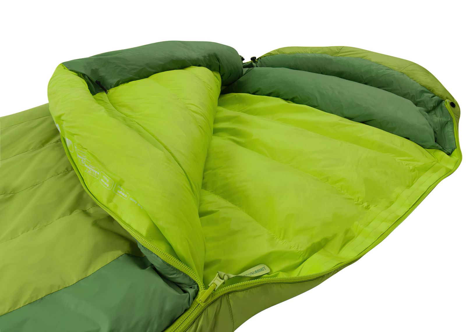 В пухових і синтетичних спальниках, позначених символом застібки-блискавки, використовується повнорозмірна блискавка YKK №5 довжиною 165 см, яка дозволяє поєднувати унісекс спальники, які випускаються тільки Left лівої блискавкою і жіночі спальники, які випускаються з Right правої блискавкою. Розроблено для спільного використання, кожна людина спить у своєму спальному мішку, що дозволяє кожному скористатися унікальними ізоляційними зонами свого спальника. Капюшон і зона в ногах - ідеально підходять для затишних пригод вдвох.