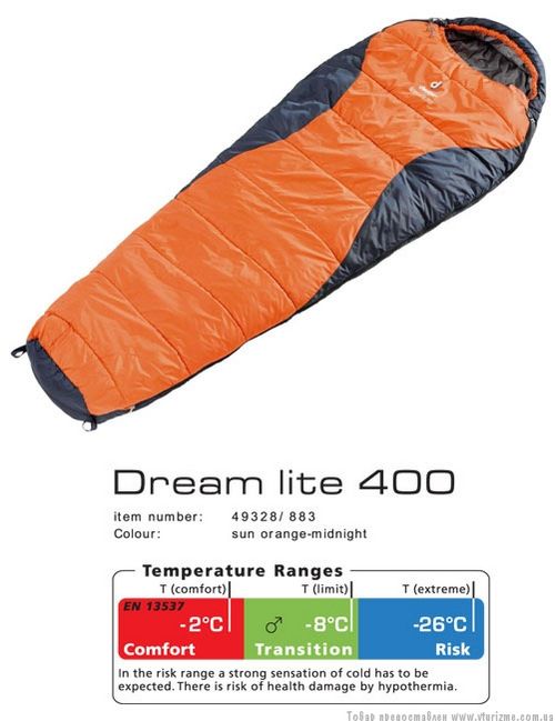 Зимовий теплий спальник Deuter Dream Lite 400 зроблений з міцної і приємною на дотик тканини, утеплений м'яким синтетичним наповнювачем, дуже компактний в складеному стані, що робить його ідеальним спальним мішком для тих, кому потрібен мінімальний вага і розмір. Підходить для людей ростом до 185 см.