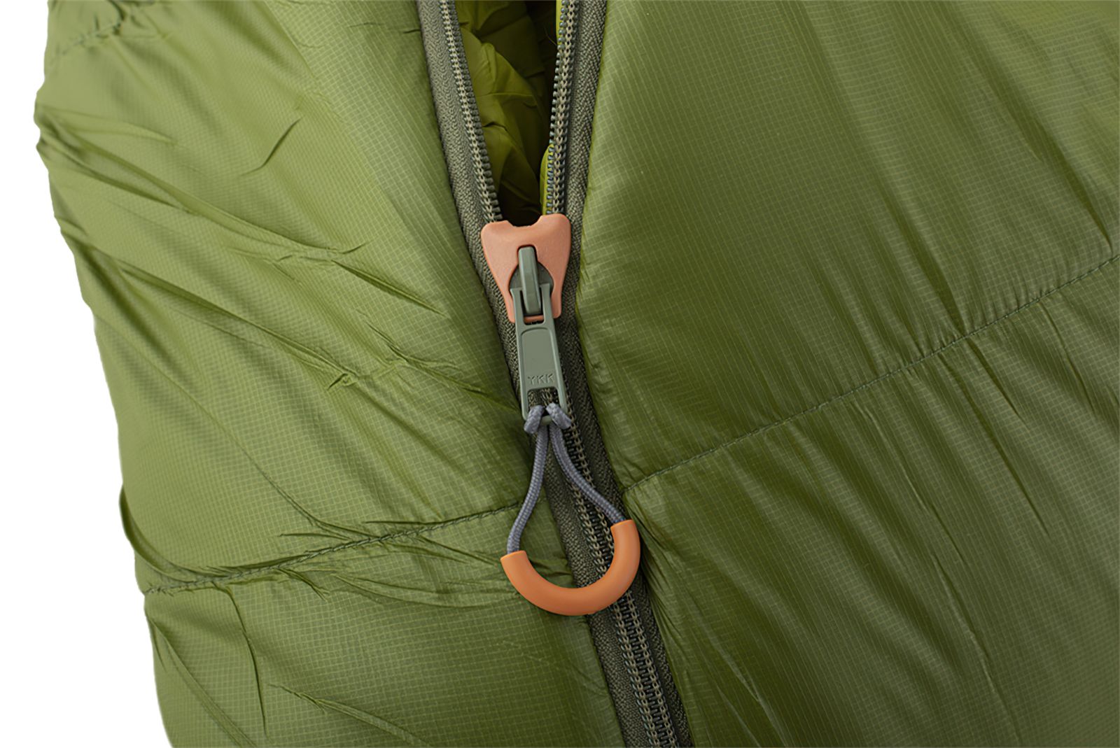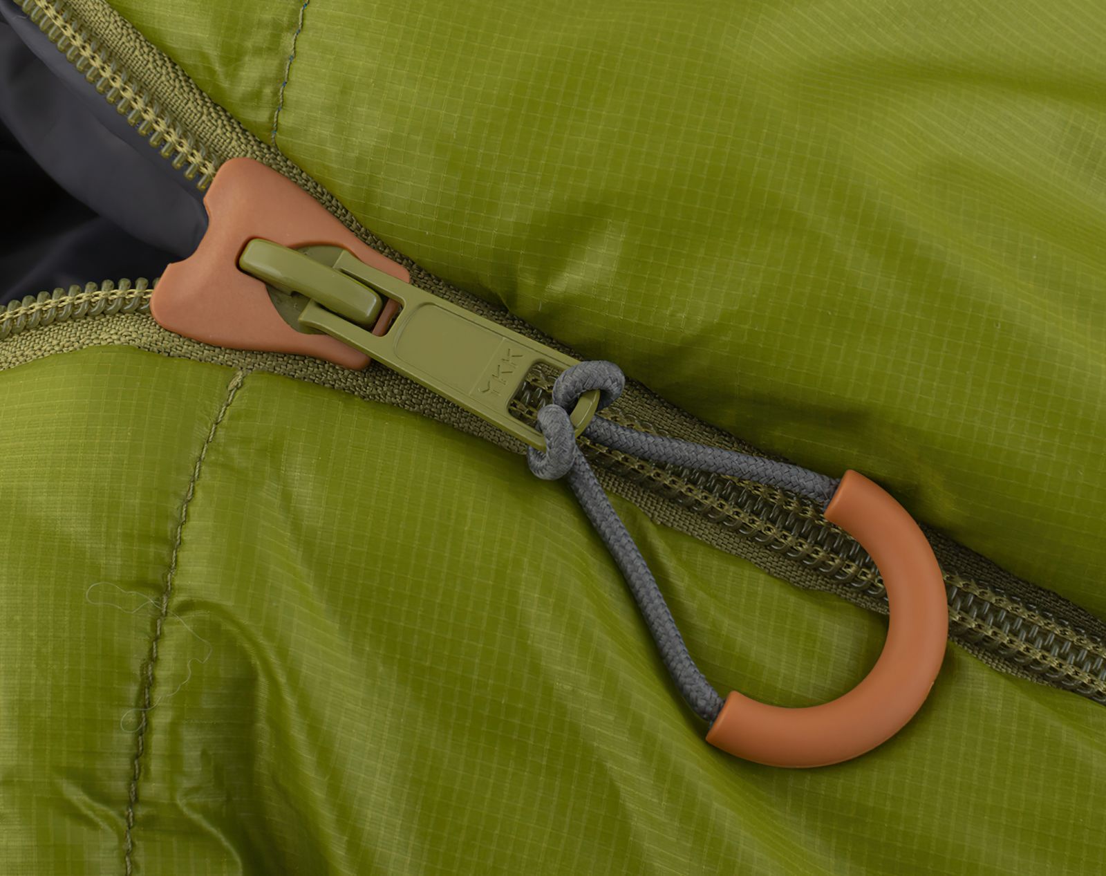 зручна двостороння надзвичайно надійна блискавка японської компанії YKK, оскільки ми знаємо, що спочатку почнуть псуватися ноги, ми адаптували дизайн спальника так, щоб блискавка вкорочувалася і закінчувалася приблизно посередині стегон, тому замість блискавки ми могли б додати більше ізолюючого наповнювача збоку