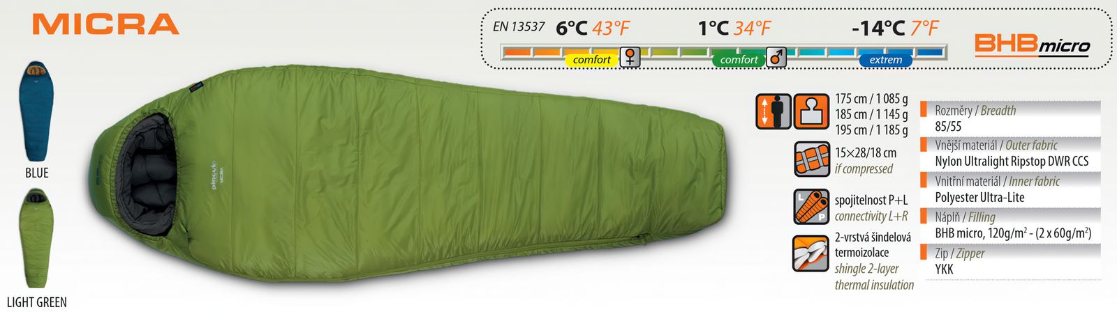 Літній спальник Pinguin Micra CCS для туристів зростом висотою до 185 см включно. Спальний мішок у формі кокона з капюшоном, двошаровий конструкція синтетичного утеплювача BHB Micro, забезпечує тепловою діапазон, що дозволяє його використовувати не тільки влітку, для якого він в першу чергу призначений, але також навесні і ранньою осінню. Двостороння блискавка дозволяє практично повністю відкривати спальний мішок для регулювання внутрішньої температури, а також з'єднувати разом два спальника з лівої і правої блискавками. Маючи вагу в один кілограм і відмінно впаковується, завдяки доданим компрессионному мішку, його можна використовувати як для заходів вихідного дня, так і для багатоденних походів в невисокі гори. Літні походи тільки з Micra!