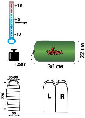 Спальний мішок-кокон Totem Hunter довжиною 220 см і збільшеною шириною 90 см, в плечах і 55 см в ногах. Відмінний спальник для походів у весняно-осінній періоди року. Його можна також зістебнути парно з іншим спальним мішком. Упаковується в високоякісний компресійний чохол.