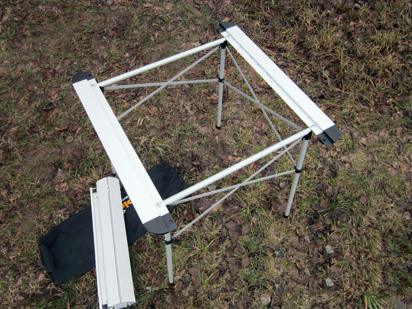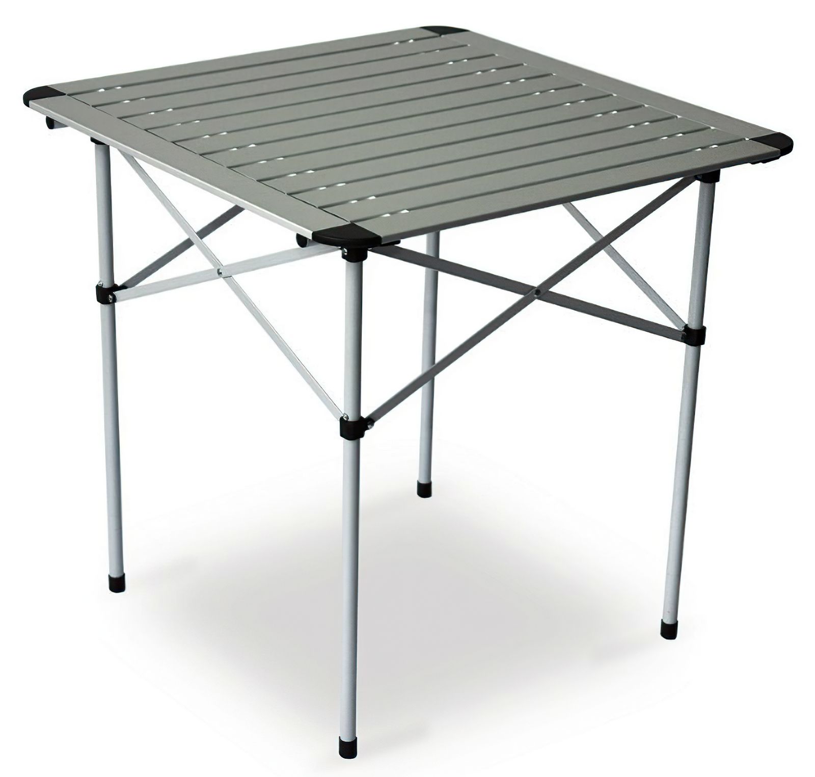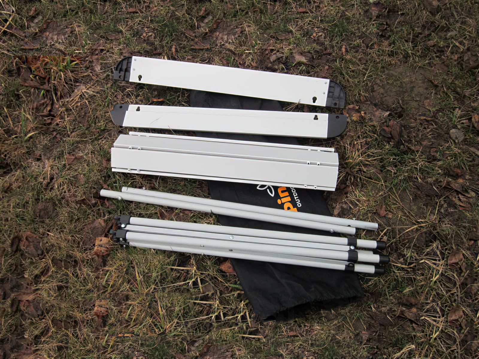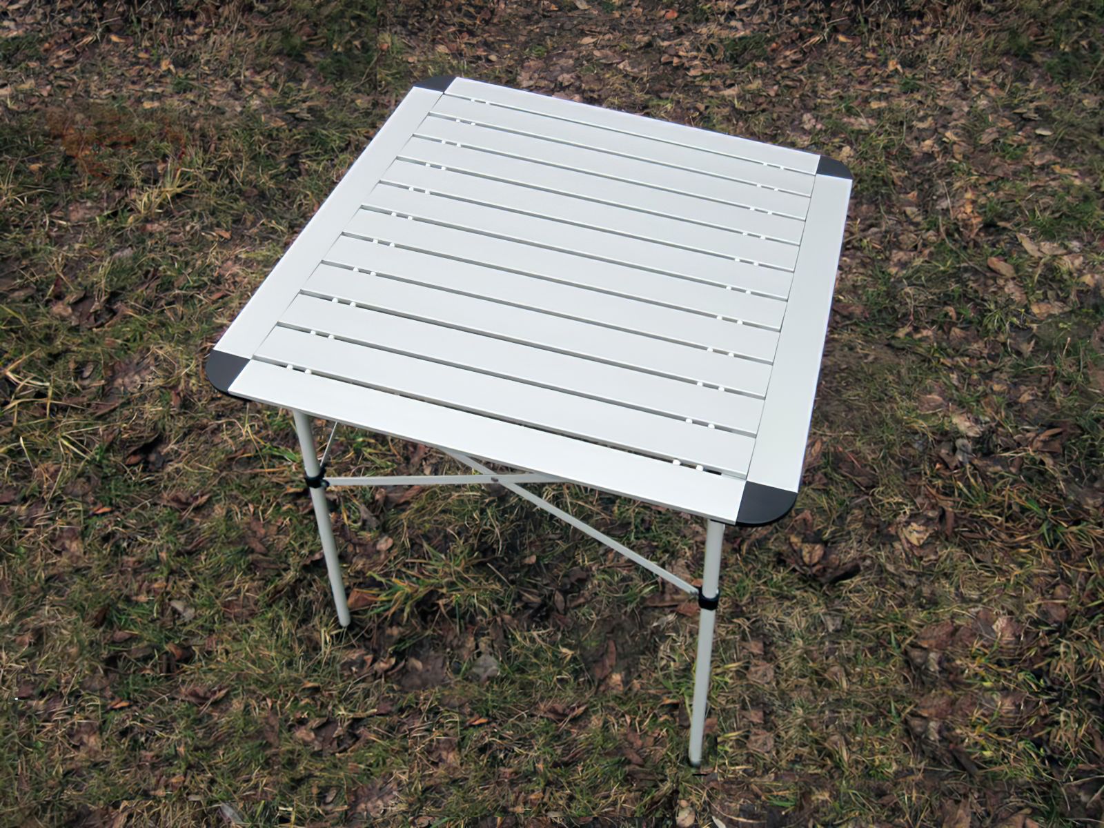 - Стільниця виготовлена з набору пласких алюмінієвих профілів, з'єднаних між собою гумовою мотузкою, подібним чином з'єднуються каркаси в наметах