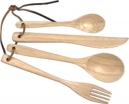 Столовий набір, легкий і приємний у використанні, виготовлений з міцних порід дерева. Тепло натуральних матеріалів – незмінна якість гарного подарунку близькій людині. Дерев'яний посуд добре використовувати на природі – вона не буває занадто холодною або дуже гарячої, а продукти при контакті з деревом не втрачають своїх корисних природних властивостей. Для зручності набір оснащений шкіряним шнурком.