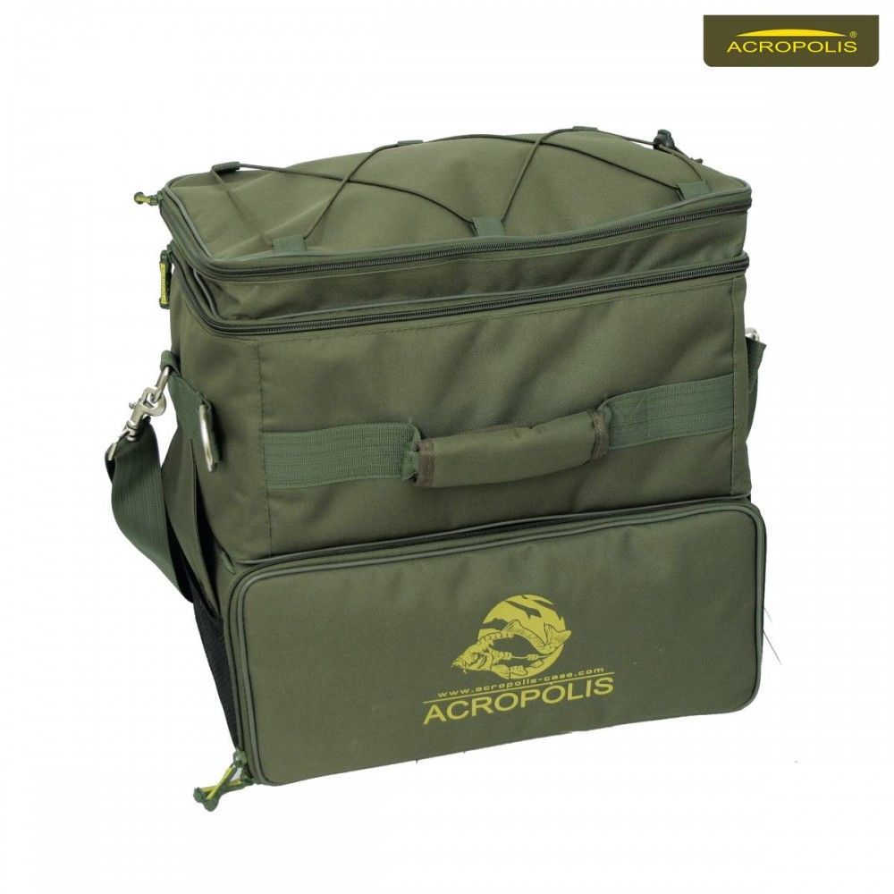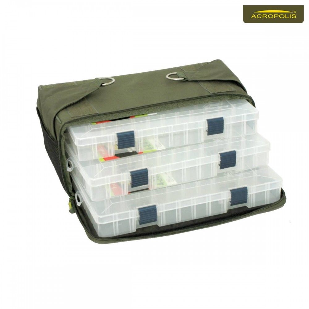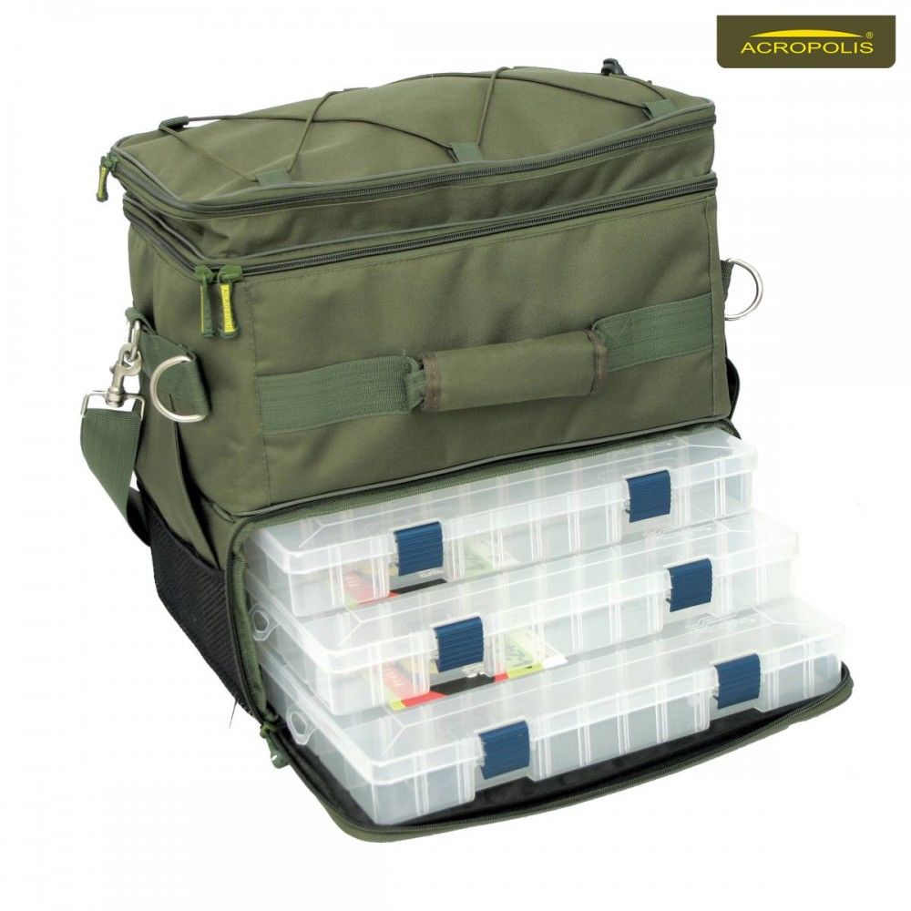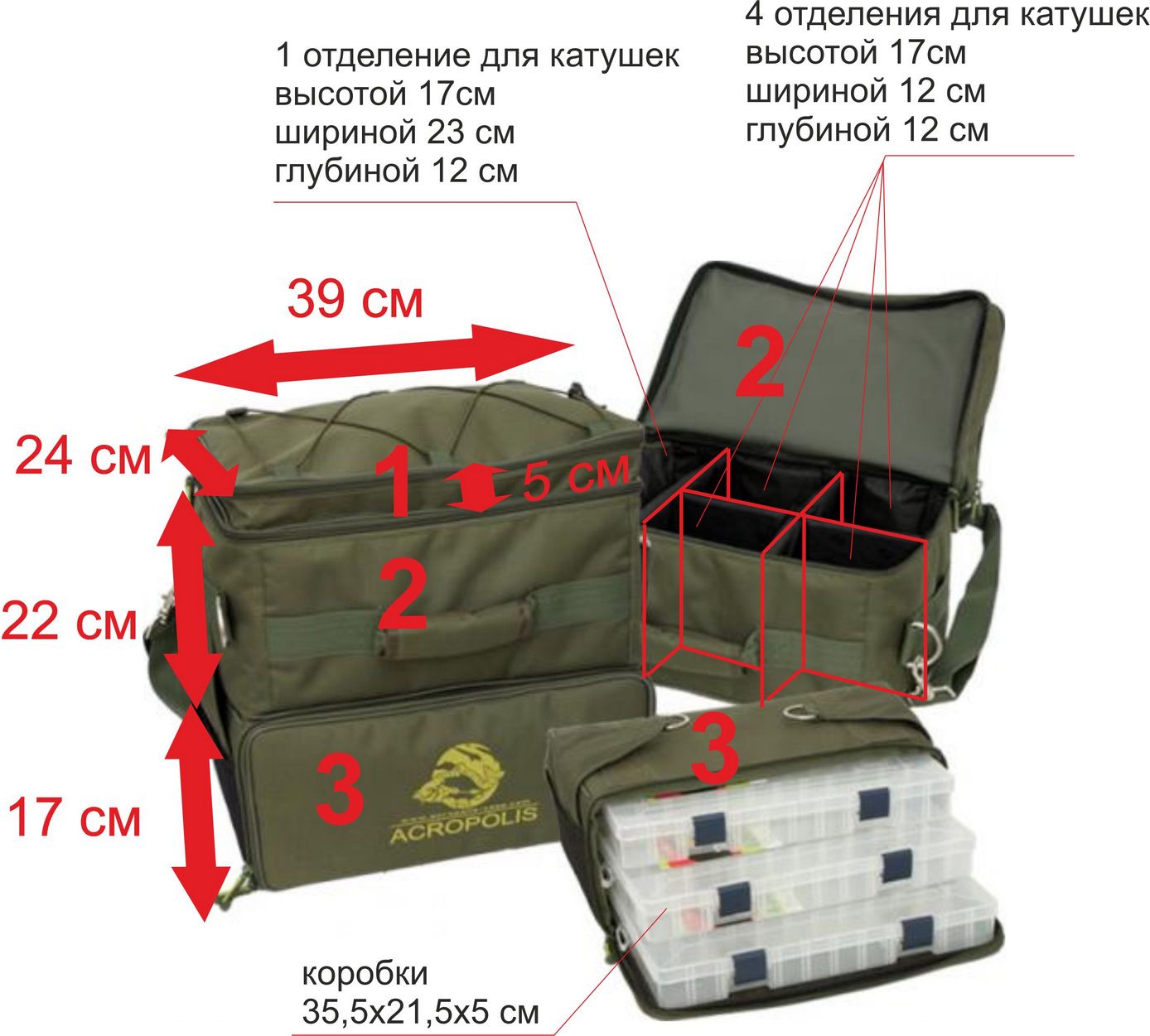 Сумка рибальська ІІІ-х секційна. І-ша секція призначена для зберігання і транспортування дрібних аксесуарів та інструментів. ІІ-а секція з мобільними перегородками - для котушок з запасними шпулями - до 6 штук, III-я секція укомплеквтованная 3-ма коробками (35,5х21,5х5) під аксесуари.