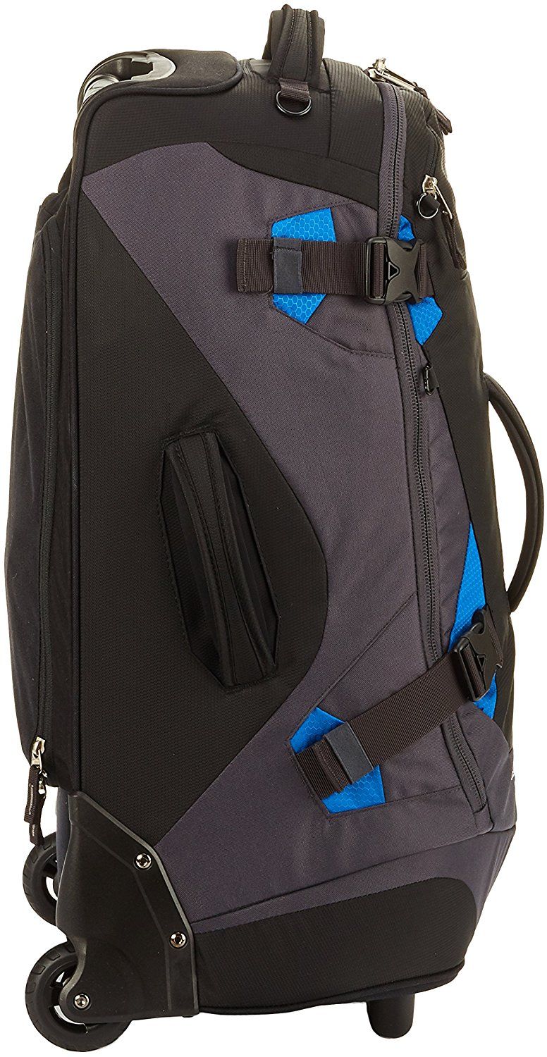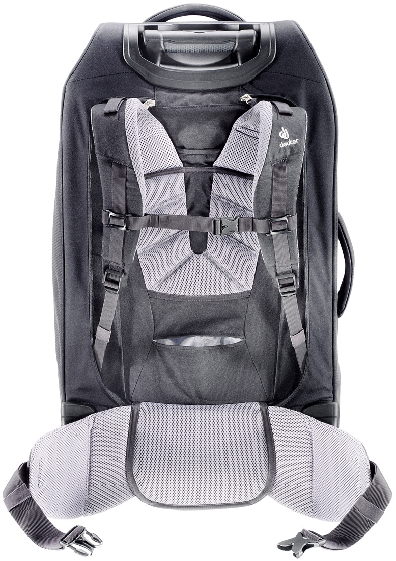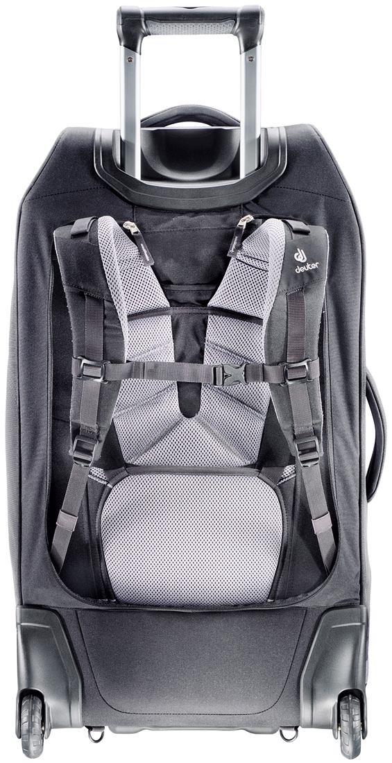 Дорожня комбінована сумка - рюкзак на колесах Deuter Helion 60. Багатолюдні аеропорти, бордюри тротуарів, круті сходи – багатофункціональна сумка Helion об'ємом 60 літрів, гарантує вам зручне маневрування, куди б ви не потрапили. Вміст надійно захищене, як у валізі-візку, міцна конструкція гарантує стійкість – плюс ви легко можете перетворити цю сумку в практично справжній туристичний рюкзак. В тиловій частині під клапаном на блискавці ховається продумана система плечових лямок і поясного ременя для перенесення для перенесення сумки на спині. Можна котити сумку на коліщатках і з розгорнутими плечовими лямками. Це дуже зручно на переходах, де сумку доводиться по черзі то котити, нести. Для більшого комфорту сховайте стегнах крила, які закривають колеса при перенесенні.