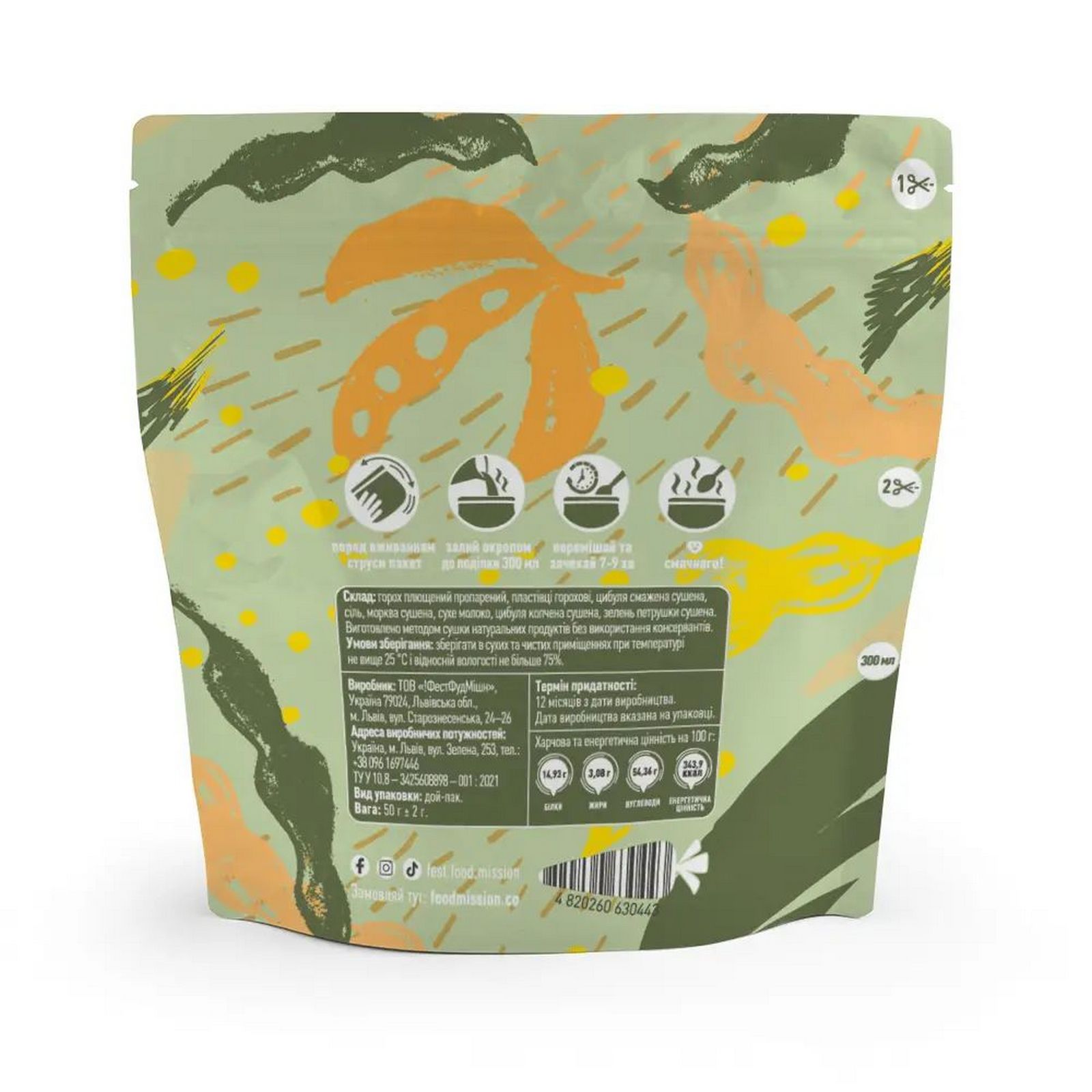 Суп гороховий Fest Food Mission – сублімована туристична їжа для походів. Складається з пропарених і сушених: горох плющений пропарений, пластівці горохові, цибуля смажена сушена, сіль, морква сушена, сухе молоко, цибуля копчена сушена, зелень петрушки сушена. Страва виготовлена методом сушіння натуральних продуктів без використання консервантів та ГМО.