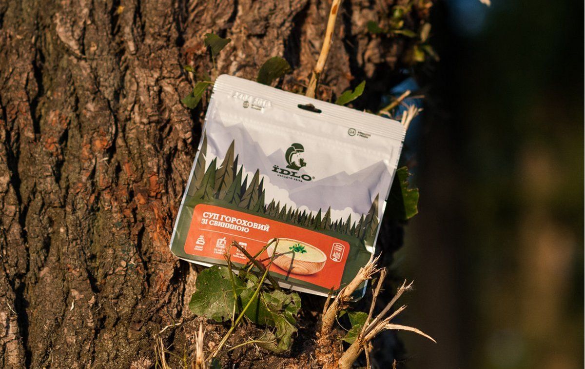 Склад: яловичина сушена варена, горохове пюре сушене, цибуля тушкована сублімована, морква тушкована сублімована, часник сушений, кріп сушений, петрушка сушена, куркума, морська сіль. Виготовлено методом інфрачервоної сушки натуральних інгредієнтів без використання консервантів і ГМО.