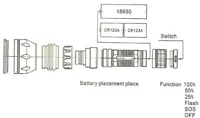 Харчування ліхтаря здійснюється від однієї барейки типу Li-ion 18650 3,7 V або ж від двох Li CR123A 3,0 V (батарейки в комплект не входять)