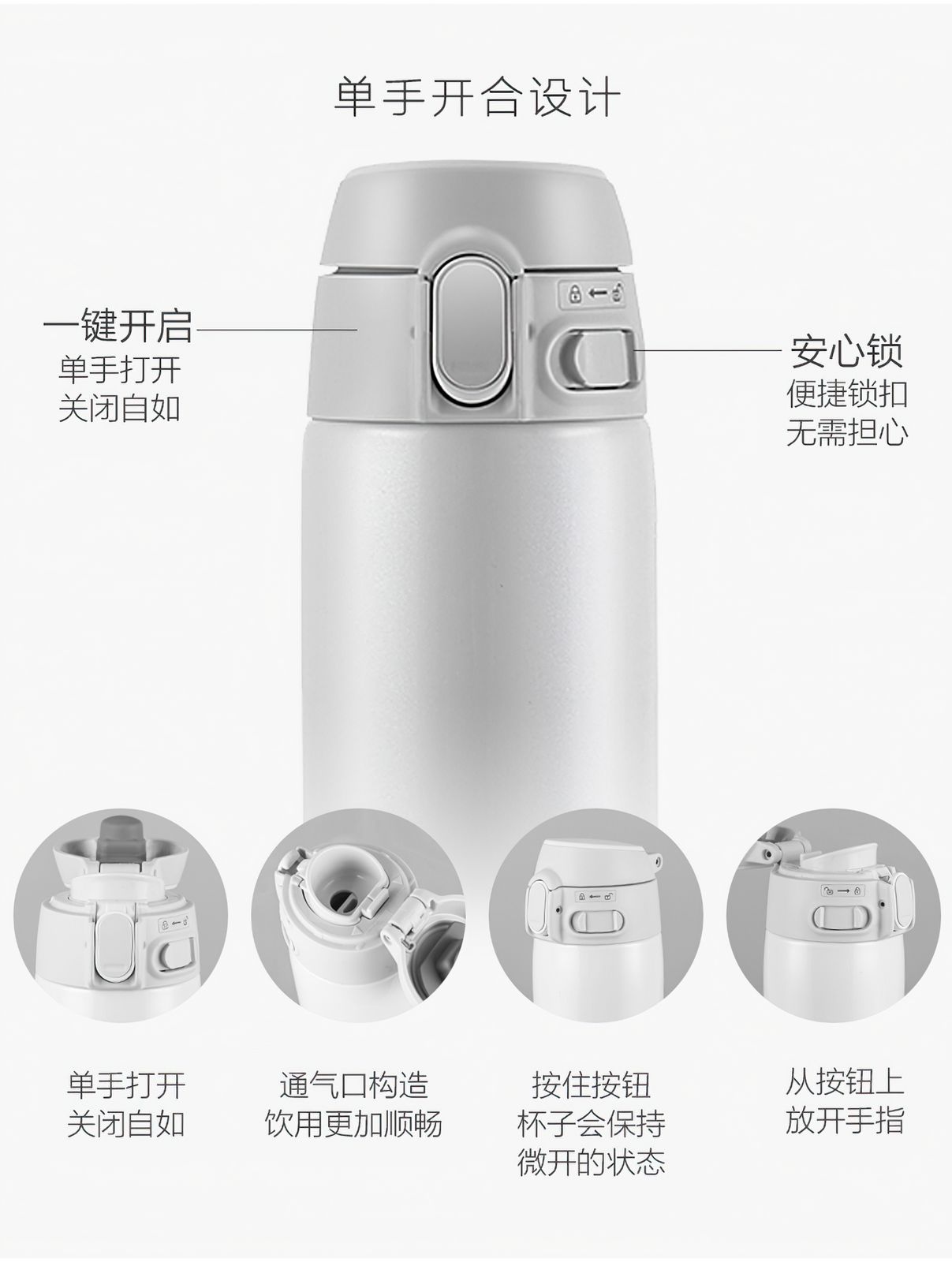 Унікальна кришка, яка автоматично відкривається після одного натискання, при цьому механізм сконструйований так, щоб запобігти появі бризок при відкриванні.Після натискання кнопки, кришка трохи відкривається, даючи можливість стекти утворився краплях. Повністю кришка розчиняться тільки після того, як ви відпустите кнопку. Також кришка додатково оснащена блокуванням від випадкового натискання на кнопку відкриття.