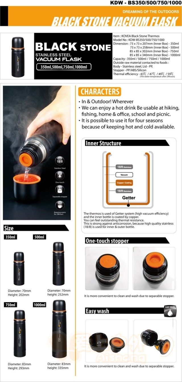 Термос Південної Корейської компанії Kovea Black Stone об'ємом 0,35 літра з двома вакуумними стінками з високоякісної харчової нержавіючої сталі 18/8 з внутрішнім покриттям міддю. Кришка термоса служить кухлем, а пробка з кнопкою дозволяє легко наливати напої. Ви зможете відчути відмінне теплове опір термоса.