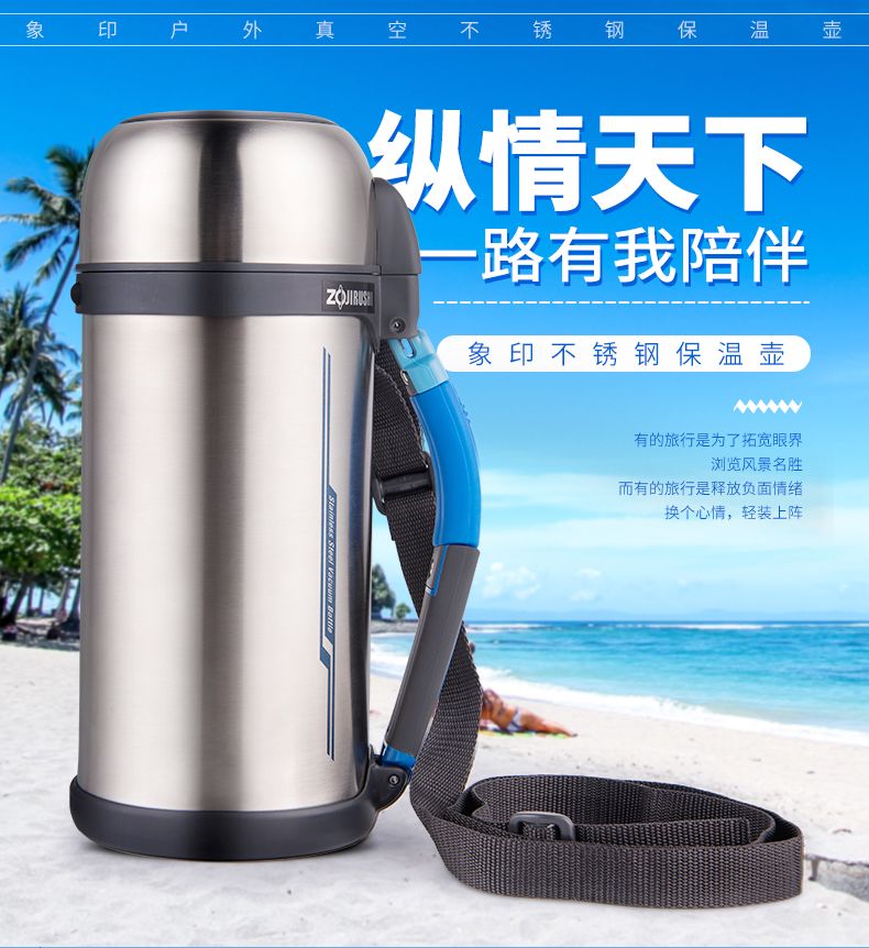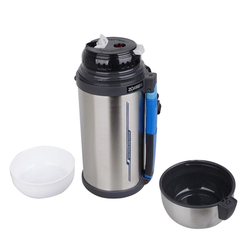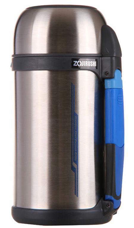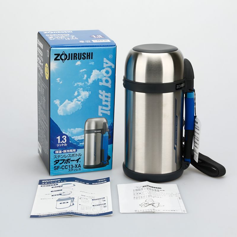 Оригінальний термос японської компанії Zojirushi SF-CC13 XA - модель Tuff Boy об'ємом 1,3 літра. Міцний сталевий корпус в пластиковому кільцевому захисному обрамленні зверху і знизу термоса зі спеціальними гумовими ніжками для стійкості в лежачій позиції. Мідне покриття зовнішньої вакуумної стінки для максимальної енергоефективності та внутрішнє захисне покриття колби тефлоном. Його легко переносити завдяки великий складаний полімерної ручці і плечового ременя. Широка діаметром 7 см горловина, основна герметична кришка з кнопкою і клапаном з носиком для зручного налития напою, подвійна кришка закриває легко перетворюється в дві кружки для розпивання чаю з друзями. Відмінний варіант для повсякденного використання, активного відпочинку, пікніків, походів або спортивних заходів.