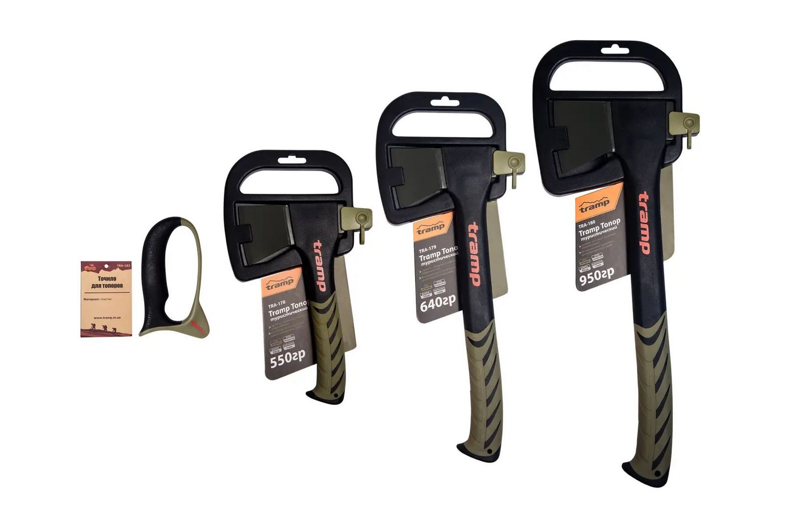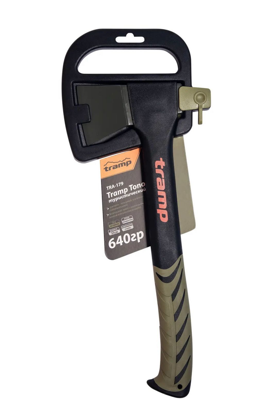Туристична сокира Tramp TRA-179 довжиною 35 см, сталеве лезо з тефлоновим покриттям, сокирищем з армованого скловолокном поліаміду та з покриттям термопластичною гумою. Вага 640 грамів.
