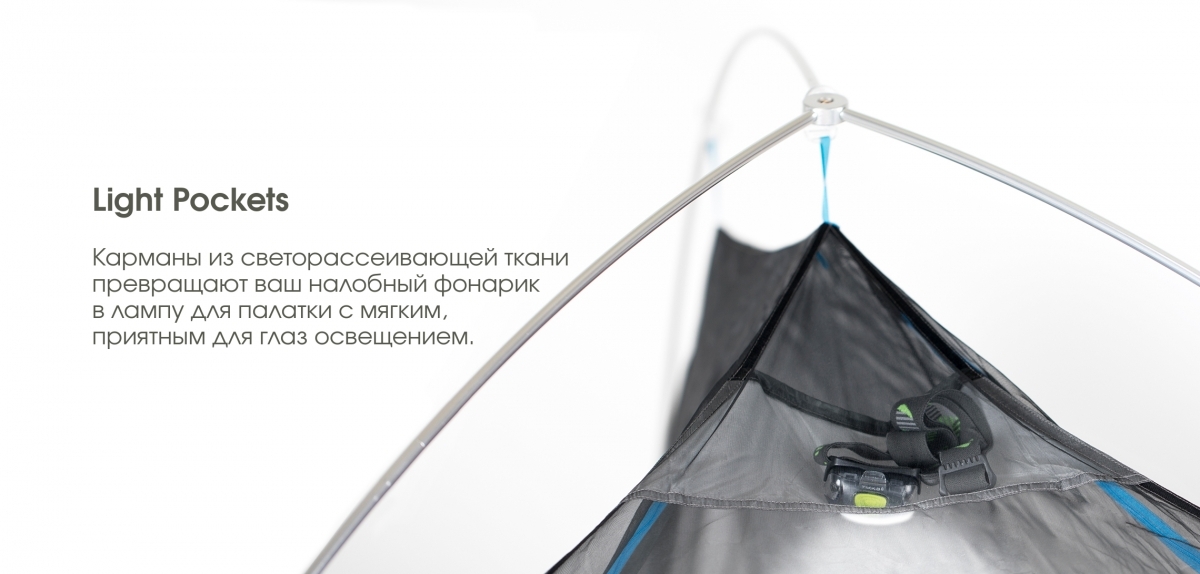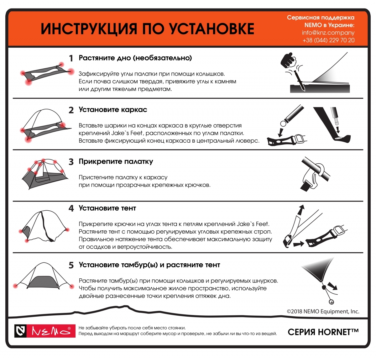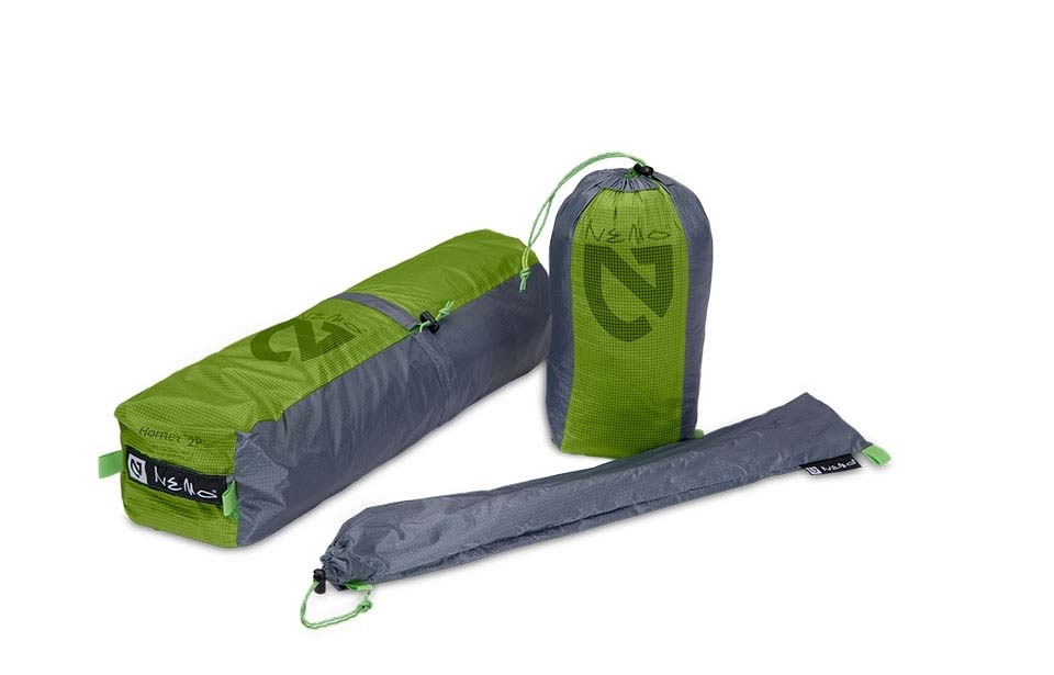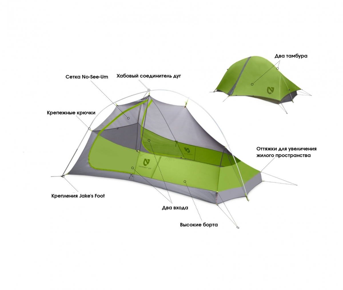 Хабовый каркас забезпечує вільностоячій конструкцію, швидку установку і мінімальна вага дуги. Дві рознесені точки кріплення відтяжок дна збільшують житловий простір намети на 15%. А продуманий до дрібниць дизайн і високотехнологічні матеріали гарантують задоволення від використання NEMO Hornet.