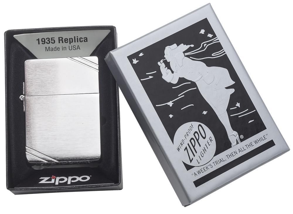 Оригінальна запальничка Zippo 1935 Replica with Slashes репліка моделі 1935 року з подвійними насічками. Задній шарнір, що з'єднує кришку і корпус з відкритою порожнистої заклепкою, яка кріпить кремень до внутрішнього блоку. Ця запальничка має плоску основу і унікальну нижню друк. Поставляється в подарунковій коробці і є шикарним подарунком для чоловіка на будь-яке свято, ювілей. Для досягнення оптимальної продуктивності заправляйте запальничку фірмової горючою рідиною Zippo.