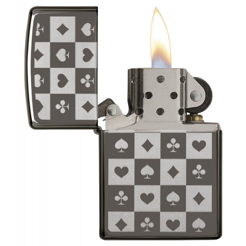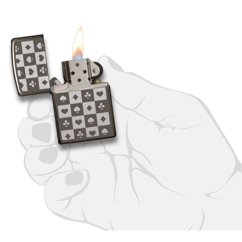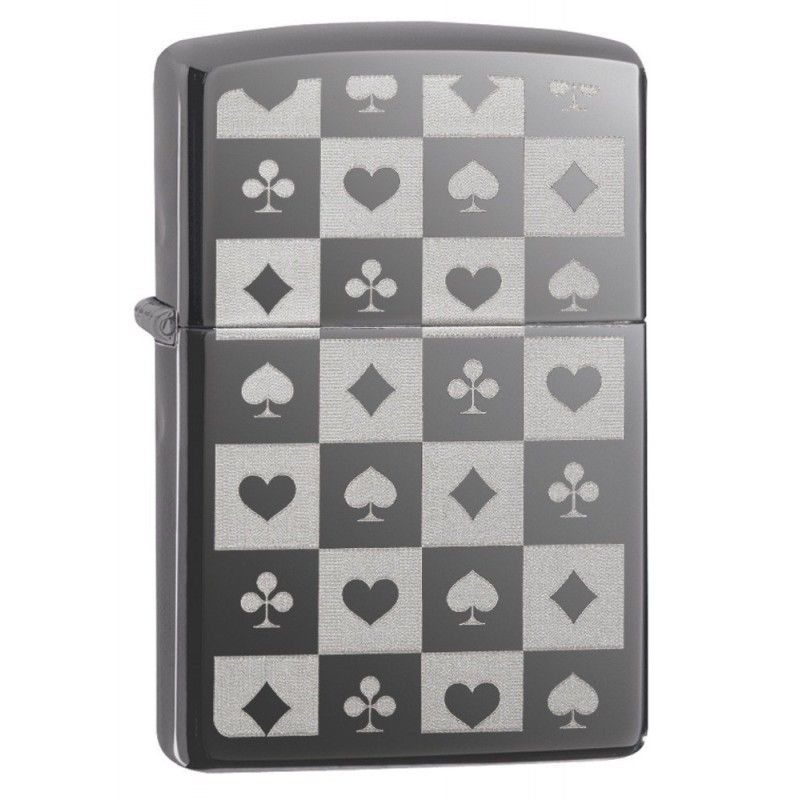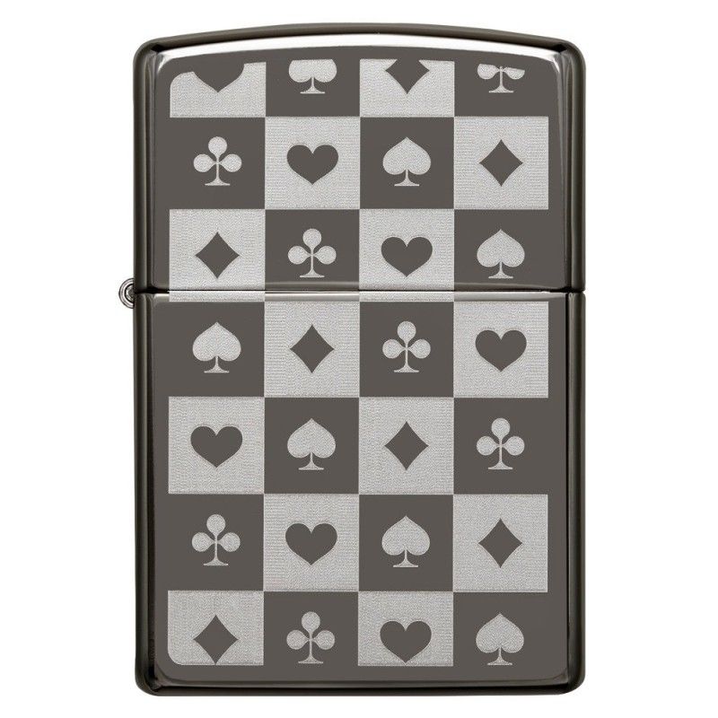 Оригінальна запальничка Zippo Card Suits, модель відрізняється гладкою чорною обробкою поверхні. На поверхні вигравійовано зображення гральних карт. Поставляється в подарунковій коробці і є шикарним подарунком для чоловіка на будь-яке свято, ювілей. Для досягнення оптимальної продуктивності заправляйте запальничку фірмової горючою рідиною Zippo.