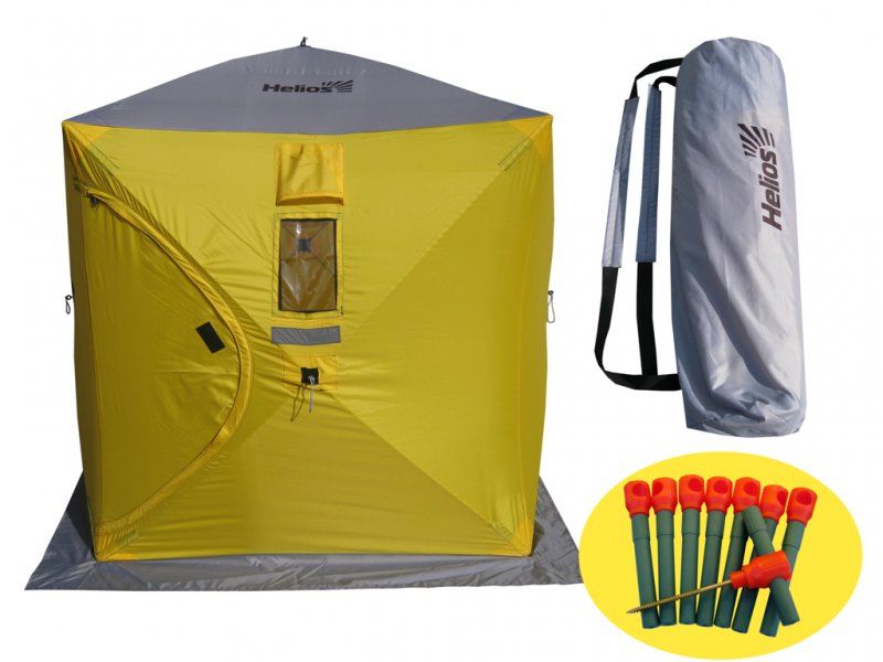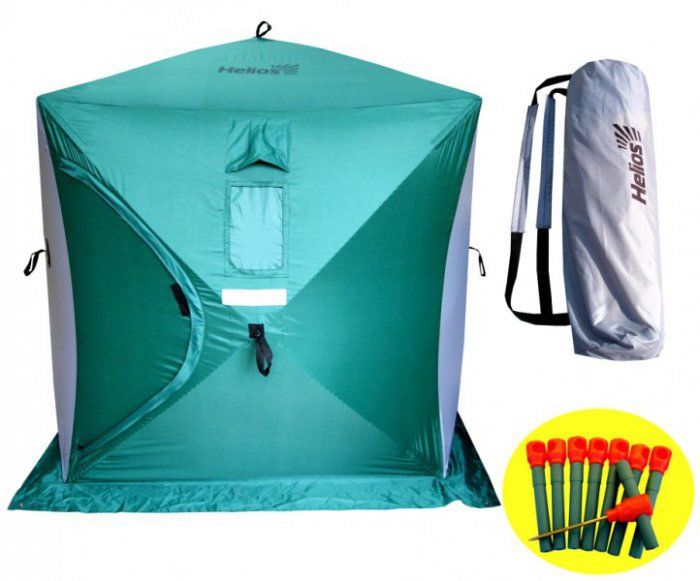 Простора намет Куб Helios 1,8x1,8 ідеальна для зимової риболовлі. Квадратна форма намету дозволяє більш ефективно використовувати внутрішній простір в порівнянні з куполоподібними . В кути куба зручно встане і балон з газом, і рюкзак і сумка з речами, так і розкладушка, не з'їдаючи призначене для лову простір. Швидко встановлюється, витримує сильні пориви вітру, кріпиться на лід. В такому наметі не страшні ні сніг, ні дощ, ні сильні морози. Вогнетривке просочення дозволяє використовувати всередині намету обігрівачі. Зручна упаковка сумка-рюкзак.